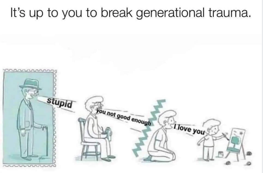 Too many people bear the burden of generational trauma. It can be hard to see it while you’re in it, but with awareness, it becomes clear that it is not your fault. It is a product of history, culture, and family circumstances. No path to healing is easy, but it becomes easier when you stop running from it.